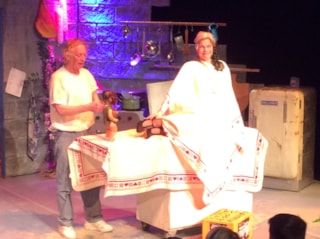 Direct bij binnenkomst rook het alsof we een Grieks restaurant binnenstapten en dat was ook zo. We werden welkom geheten door Maria en Petros, maar er was al direct een lichte paniek. Er was iets mis gegaan met de reservering, waardoor het eten en de tafeltjes nog niet klaar stonden. Om de wachttijd te overbruggen, werden we ‘getrakteerd’ op het heldenverhaal van Odysseus. Op een verrassende manier gespeeld door babypoppen en met keukengerei als attribuut.