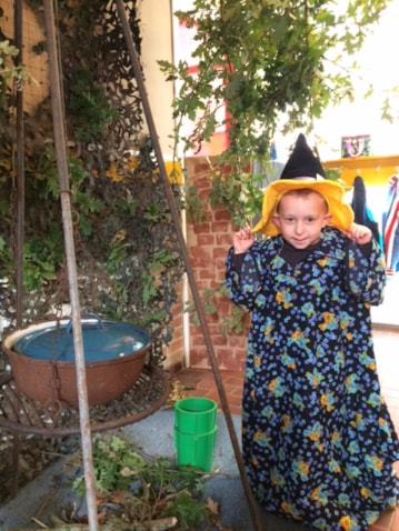 Ook zijn we bezig met het maken van een heksenhuis. We lezen in de klas het boek van Foeksia de miniheks en we proberen het huis van de tovenaar Kwark na te maken.