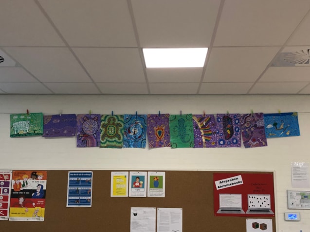 De Aboriginal schilderijen hangen inmiddels ook aan de muur. Ze zijn mooi geworden! De een heeft een verhaal gemaakt met de tekeningen die de Aboriginals ook gebruikten en de ander heeft voor een dier gekozen. We keken welk werkje je ook terug zou kunnen vinden bij de Aboriginals: duidelijke stippen en geen lege plekken.