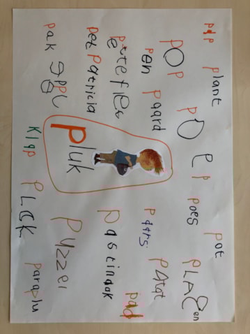 We hebben de letter āpā behandeld. De kinderen mochten hun eigen woord schrijven of naschrijven op het blad. In onze letterkast hebben we al een paraplu en een pannenkoeken pak.