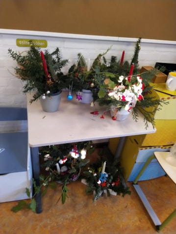 Donderdagochtend creรซerden we allemaal een mooi kerststukje in de klas. Met stukken groen, leuke ornamenten en nepsneeuw werden er prachtige stukjes gemaakt. Daarna kleurden we ons eigen tafelkleed en wisten we de klas om te toveren tot een gezellig restaurant voor het kerstdiner. Met een spetterend optreden in de kerk bliezen we de boel omver en aten we onze buikjes rond met al die heerlijke hapjes. Vrijdag genoten we het kerstspel van groep 7 en ruimden we de klas weer netjes op.