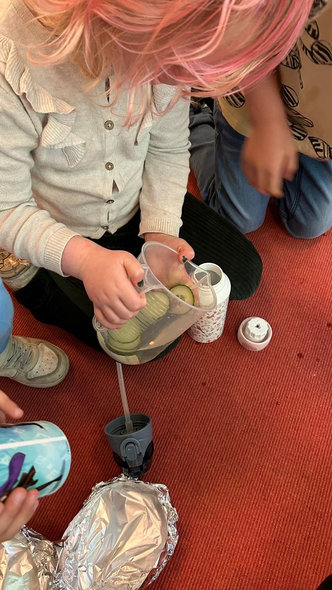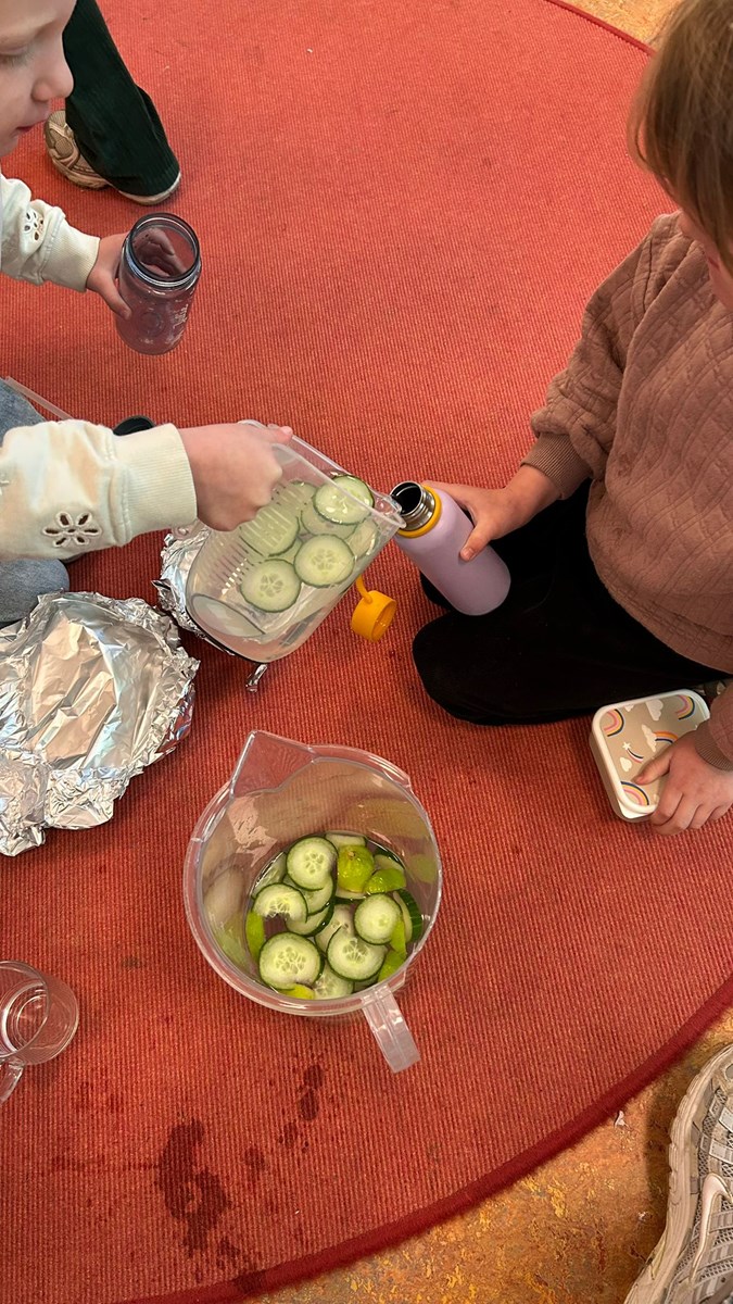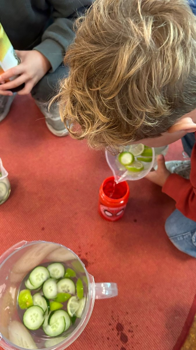 Woensdag was het ‘Nationale Kraanwaterdag’. We proefden water met een smaakje: komkommer, citroen of een combinatie van beide. De kinderen vonden het zo leuk en lekker, dat zij samen hebben besloten van woensdag onze vaste ‘kraanwaterdag’ te maken. Lekker én gezond.