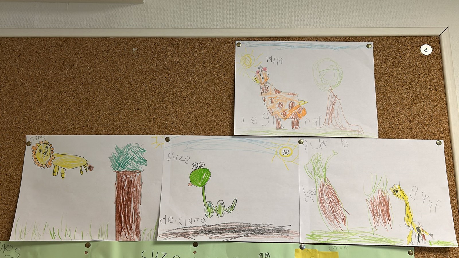 Vanaf dinsdag zijn de oudste kleuters begonnen met het tekenen van wilde dieren. Met behulp van een duidelijk stappenplan leerden zij stap voor stap hoe je een slang, giraf, olifant of leeuw tekent. De prachtige kunstwerken die hierbij zijn ontstaan hangen op het prikbord in de gang.