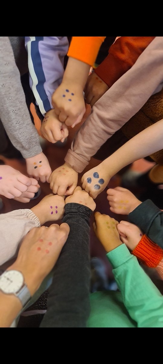 Vrijdag sloten we de Week Tegen Pesten af. Elk kind tekende vier stippen op zijn/haar hand, hiermee laten we het volgende zien: