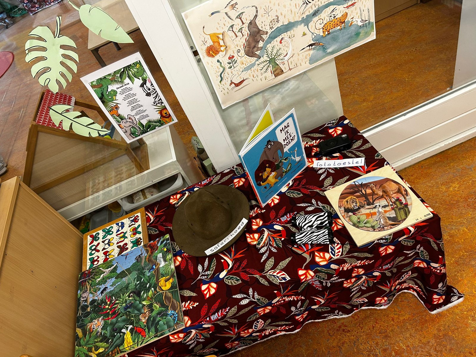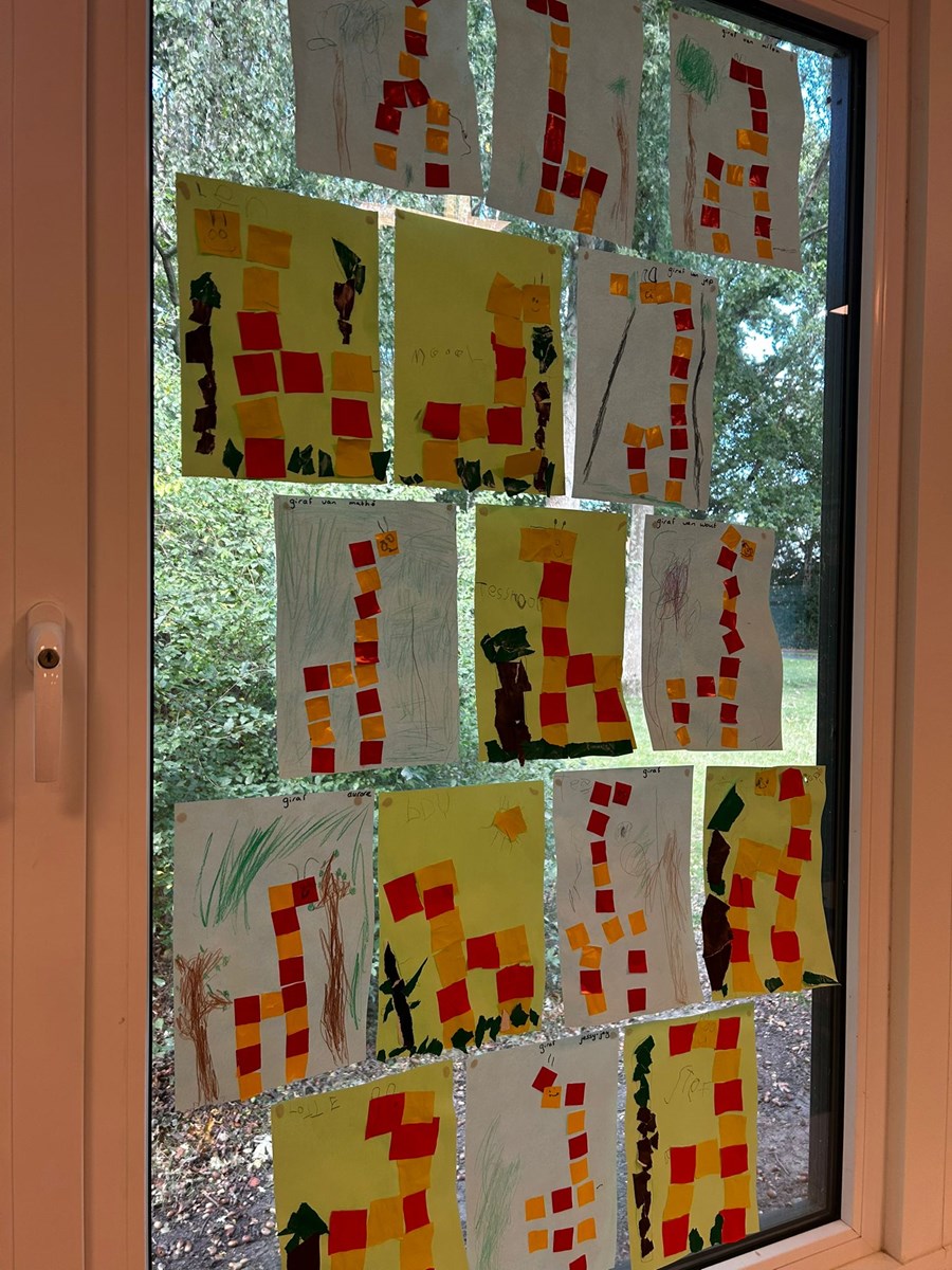 Ook hebben we vlinders gevouwen, deze hangen nu in de klas tussen de slangen. De jongste kleuters hebben een giraffe gemaakt en we zijn begonnne aan de werkjes voor in het portfolio.