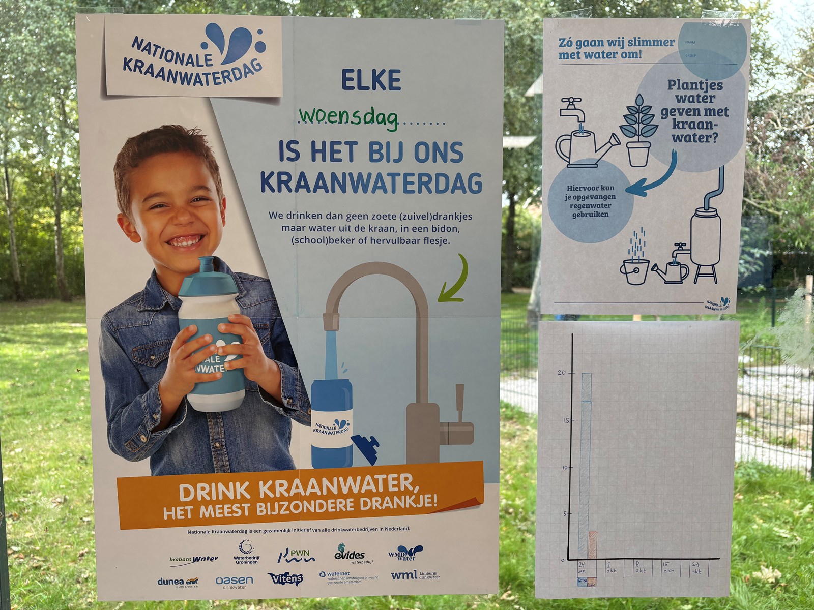 Op school drinken veel kinderen kraanwater en de klas wilde graag proberen om 1 dag in de week allemaal kraanwater mee te nemen in een eigen drinkfles. Daarvoor hebben ze gekozen voor de woensdag. In een staafgrafiek gaan we de komende woensdagen bijhouden door hoeveel kinderen er water wordt gedronken.