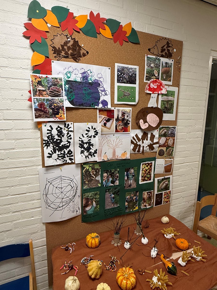 Vraag maar eens hoeveel pootjes een spin heeft, of wat een egel doet als hij bang is! Ook het lekkerste recept voor heksensoep weten de kinderen op te noemen. Op het bord in de gang zijn al onze knutsels, ervaringen en ontdekkingen te bewonderen.