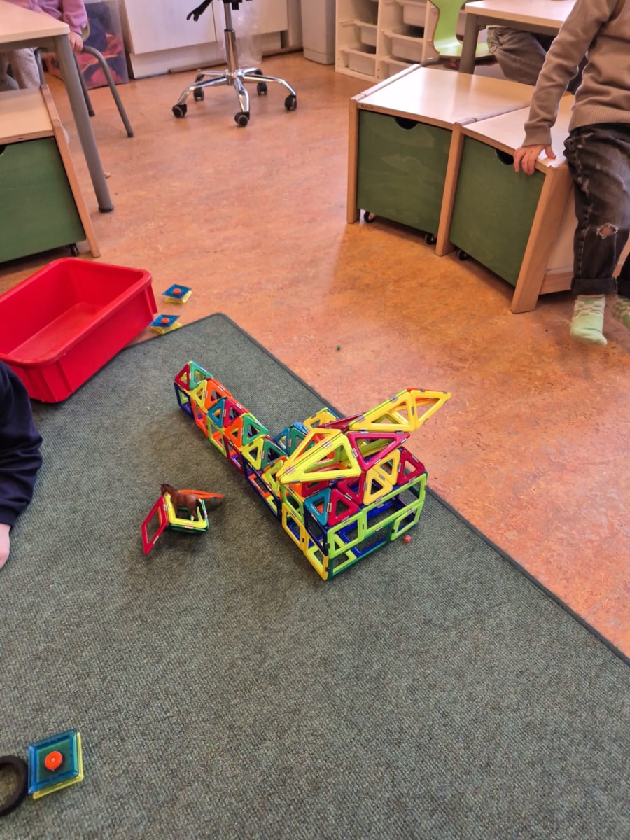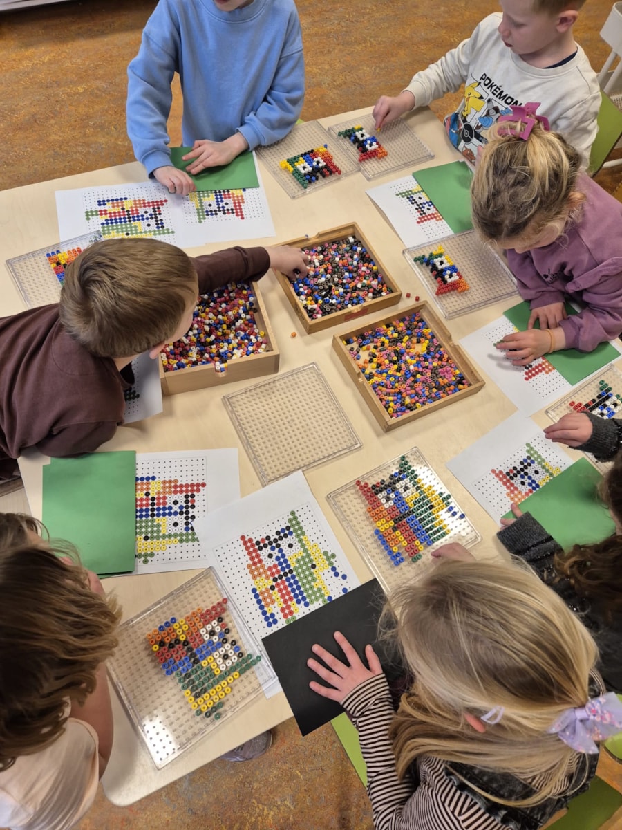 De oudste kleuters hebben een kralenplank gemaakt, aan de hand van het voorbeeld hebben de kinderen rij voor rij de kralen geteld en op de juiste plek neergelegd. Een uitdagend werkje maar met een fantastisch resultaat!