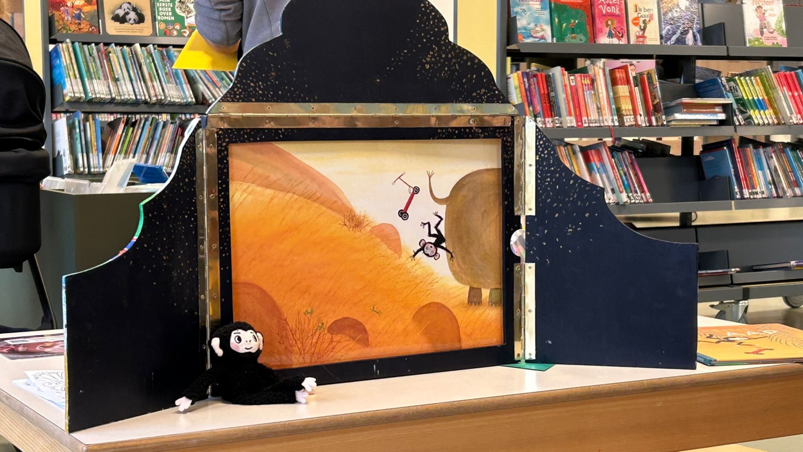 Maandag gingen we op bezoek bij de bibliotheek, daar werden wij voorgelezen uit het prentenboek van het jaar ‘Kleine Aap’. De kinderen luisterden aandachtig naar het verhaal.