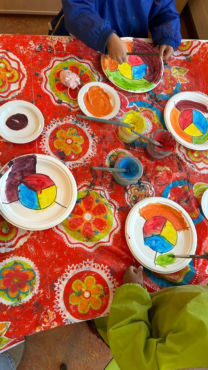 Woensdag maakten de kinderen een kleurenwiel met de primaire en secundaire kleuren. Deze hangen op het prikbord op de gang.