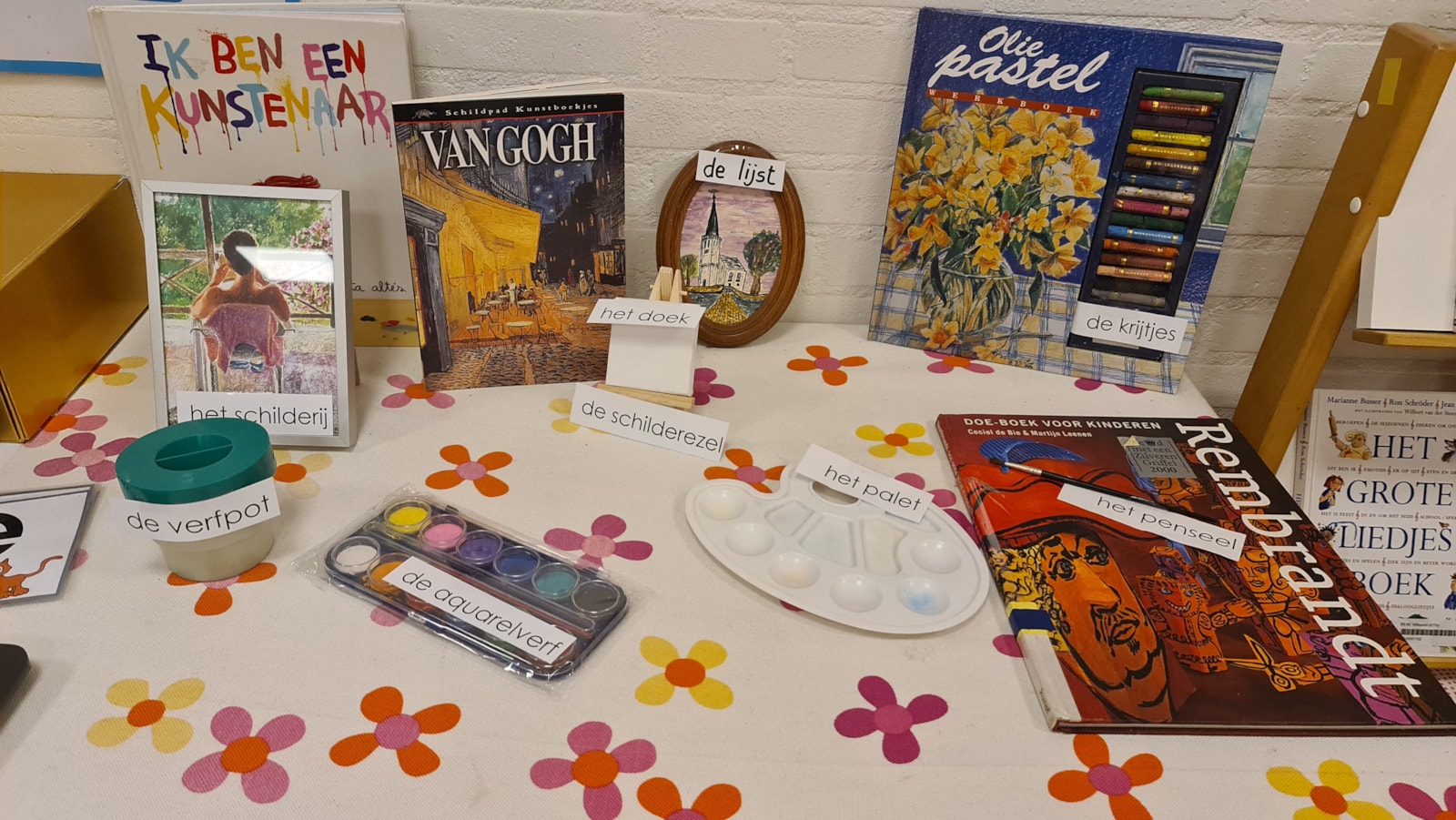 Maandagmiddag is het nieuwe thema geopend: Kunst! Als ware kunstenaars experimenteerden de kinderen op een groot vel papier met de primaire kleuren. Al snel werd er volop gemengd en kwamen zij erachter dat er een nieuwe kleur ontstaat wanneer je twee kleuren mengt.