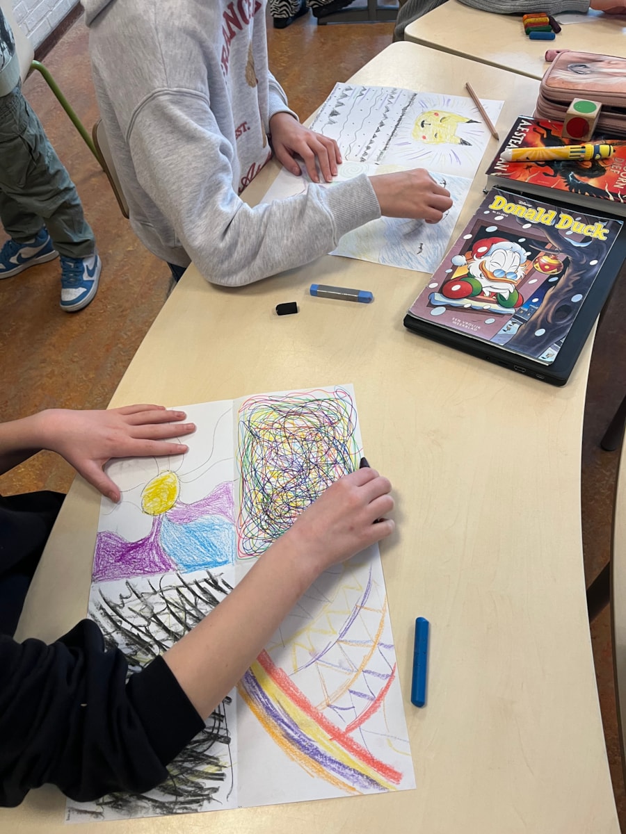 Daarnaast maakten we ons eigen kunstwerk geïnspireerd op Kandinsky. Net als hij luisterden de kinderen naar muziek en probeerden ze het gevoel dat de muziek opriep te verbeelden met kleur, vorm en beweging.