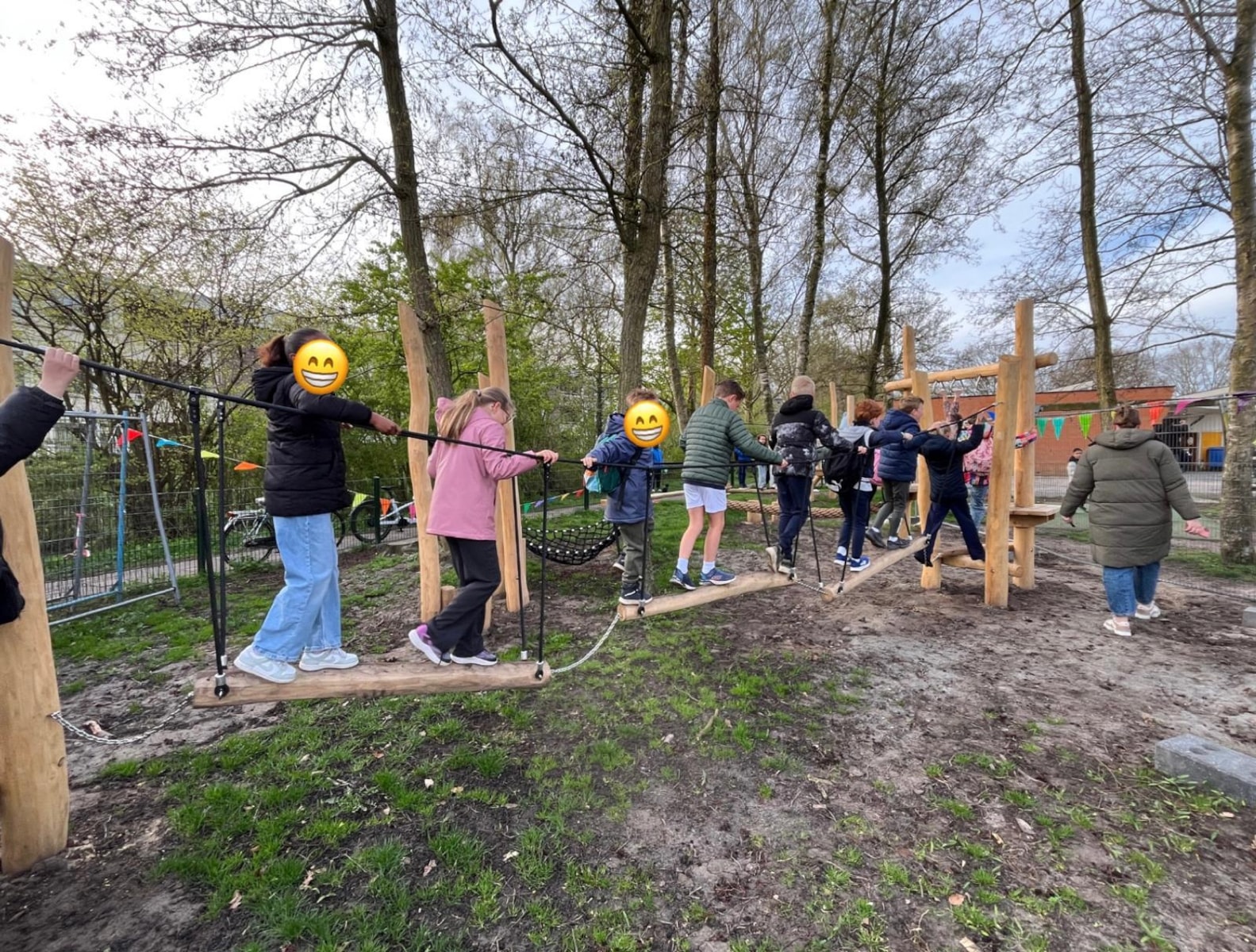 Als afsluiting van de week was er vrijdag de opening van het nieuwe speeltoestel op het onderbouwplein. Om het toestel officieel in te wijden, mochten alle kinderen van de school één keer het parcours beklimmen. Later op de dag kregen de kinderen nog de tijd om er zo vaak overheen te gaan als ze wilden. Dat leverde alleen maar lachende gezichten op! 😄