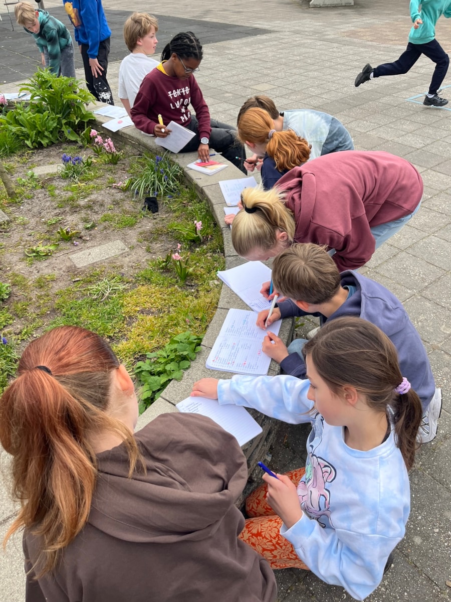 Het mooie weer nodigde deze week uit tot een aantal buitenlessen. Bij spelling deden we een propjesdictee. De kinderen renden naar een propje, lazen het woord, renden terug naar hun maatje en samen schreven ze het woord volgens de juiste spellingregels op. Zodra het eerste tweetal alle 20 woorden foutloos had ingeleverd, stopte het spel.