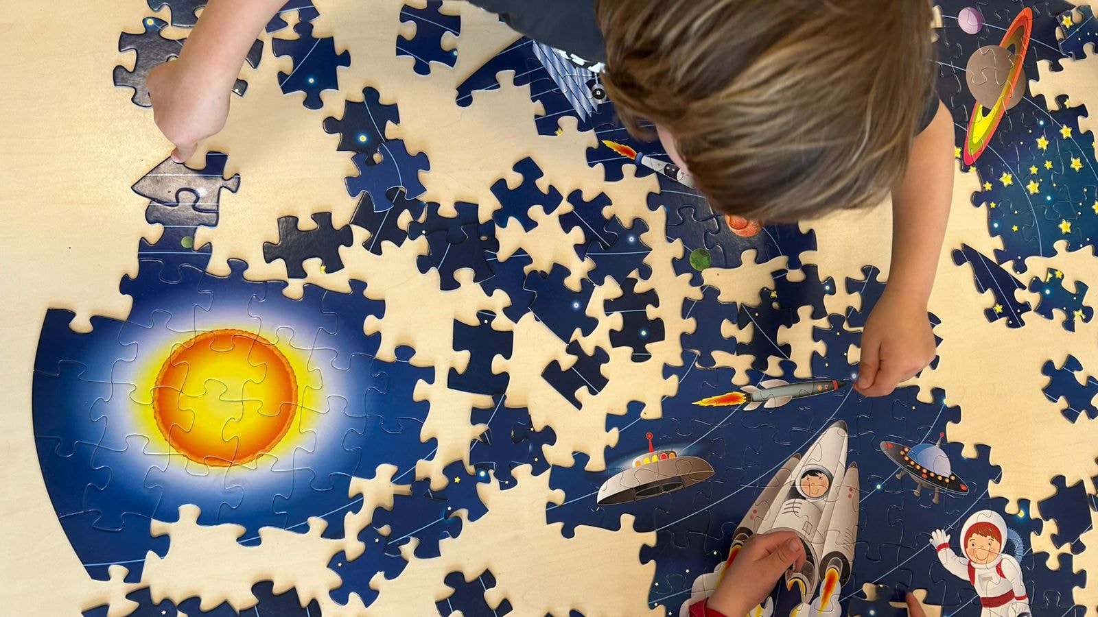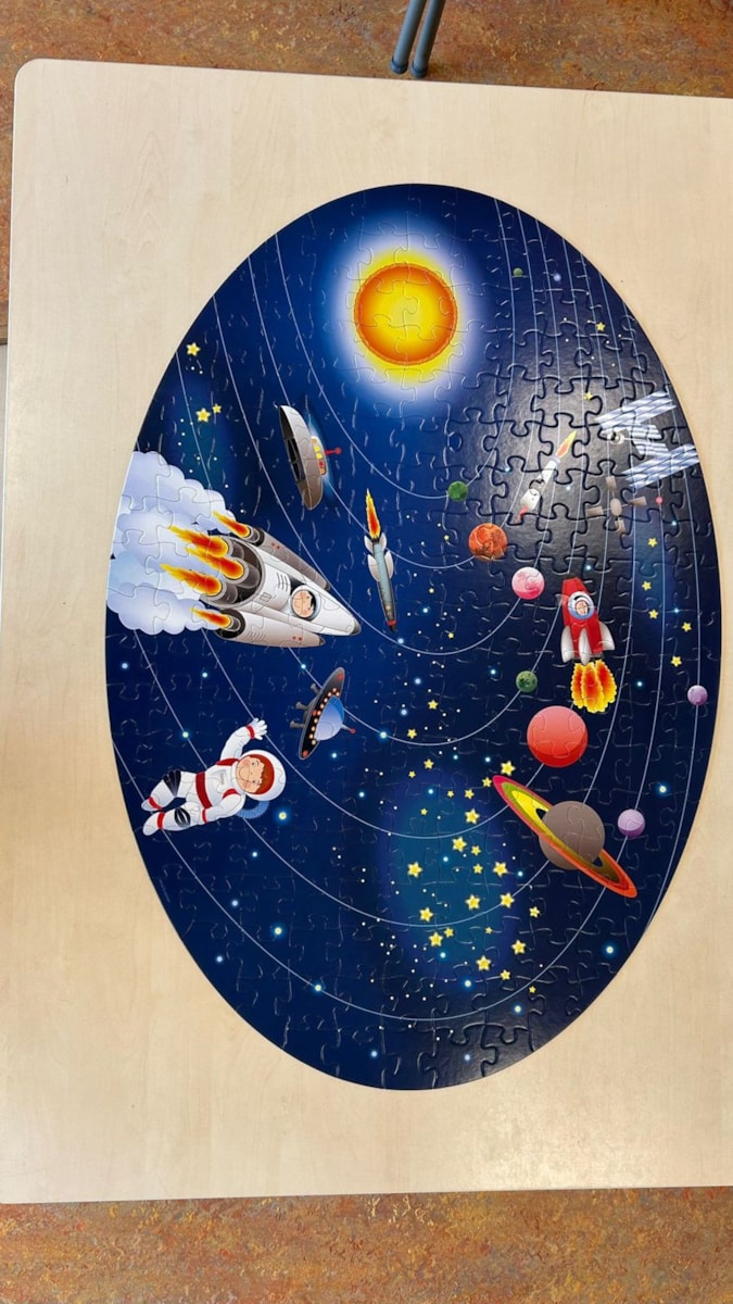 Deze week maakten we een groot groepswerk. We maakten met de hele groep een puzzel van wel 205 stukjes van de ruimte. Dit deden we natuurlijk niet allemaal tegelijk, maar in groepjes na elkaar. Bijna iedereen heeft wel een stukje in de puzzel kunnen leggen. Nadat de puzzel klaar was, waren de kinderen erg trots! En terecht!;)