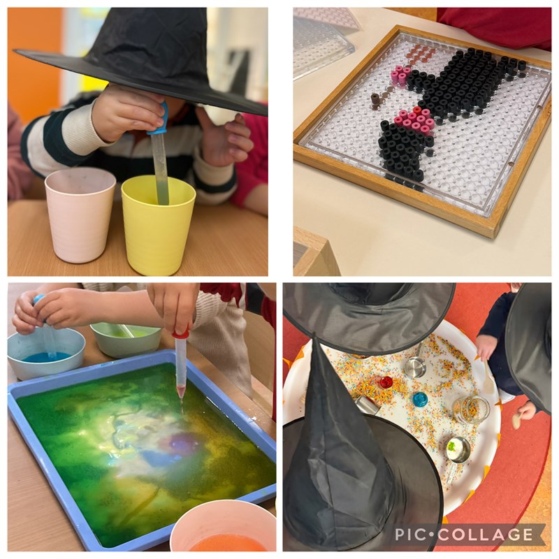 de huishoek was omgetoverd tot een echt heksenhuis waar de kinderen heksensoep konden maken. De lichttafel diende als vuur met daarop een ketel. Er waren verschillende ingrediënten beschikbaar…